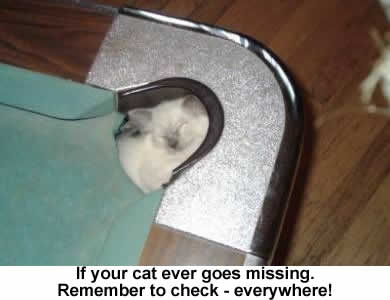 Missing cat picture with a funny pet spot. A kitten is hiding in a pool table pocket in this humorous domestic animal photo.