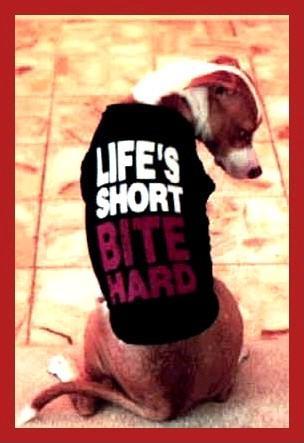 A funny pets t-shirt and dogs top saying life's short so bite hard. Some humorous canine apparel in this animal comedy pic.