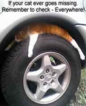 A missing cat on a car tire in this feline comedy picture. The funy kitty is sleeping in a weird spot that's hard to find.