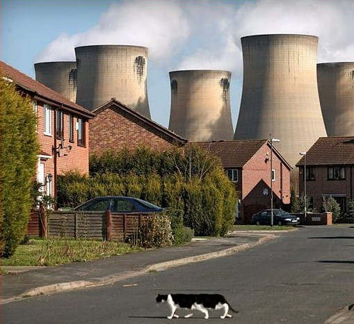 A weird mutant cat in front of a nuclear facility. This funny, pet picture has a six legged feline that's mutated because of radioactive waste.